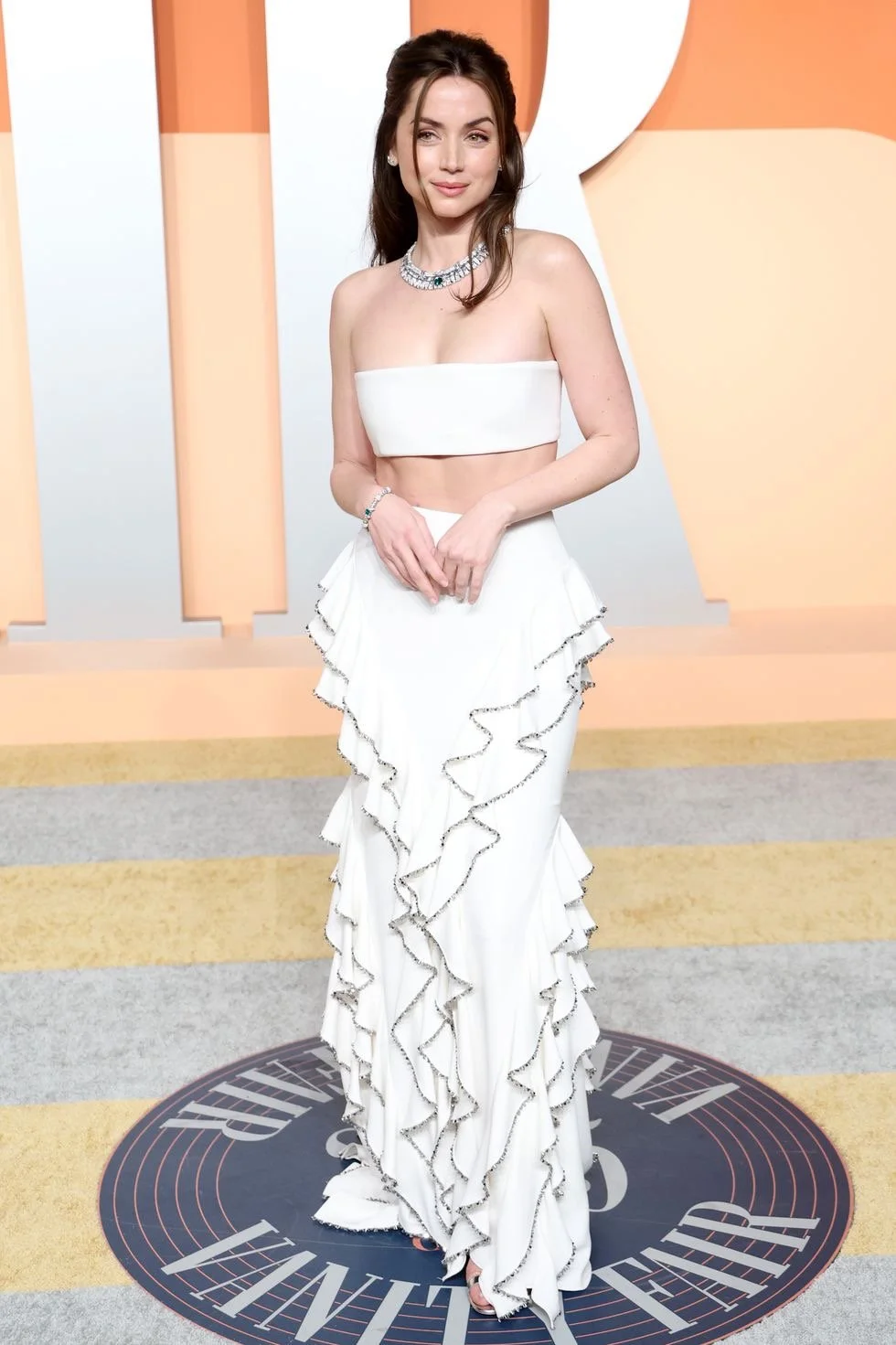 Ana de Armas in Louis Vuitton feels a little like it is her wedding reception and she just slipped on the most stunning second dress - the one she really wanted to wear, but wanted to make sure she got the more classic gown for the ceremony pictures - in absolutely the best way. I love this weird fishy skirt and the band top. I think she could look elegant in just about anything, though.