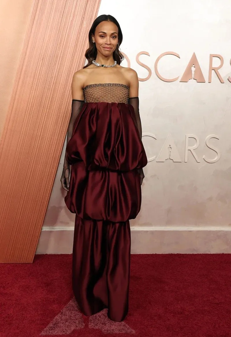I am going to be honest, I do not like this dress at all, but that color on her makes up for all of the lack of shape. This Saint Laurent gown on Zoe is hugely lacking in shape, but makes up for it in entirety by the color the they put her in. It is rich and elegant and so perfect for her.